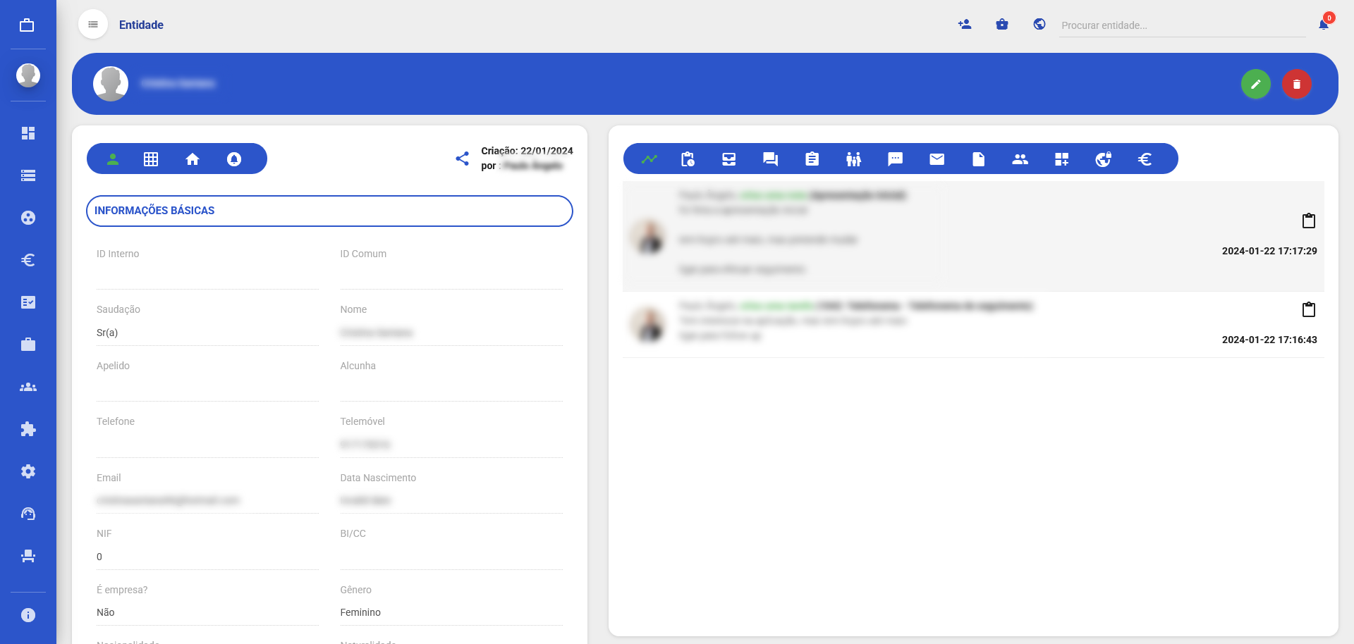 Pode editar todas as informações do Contacto clicando no botão “Editar Entidade”, disponível no canto superior direito do perfil.