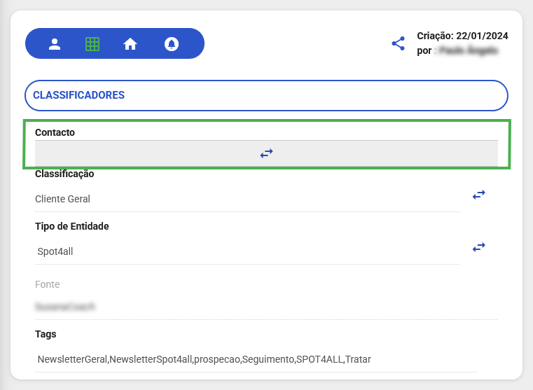 Caso pretenda modificar os campos individualmente, poderá sempre o fazer na aba de Classificadores. Utilize as setas disponíveis para definir a Classificação e o Tipo de Entidade pretendida.