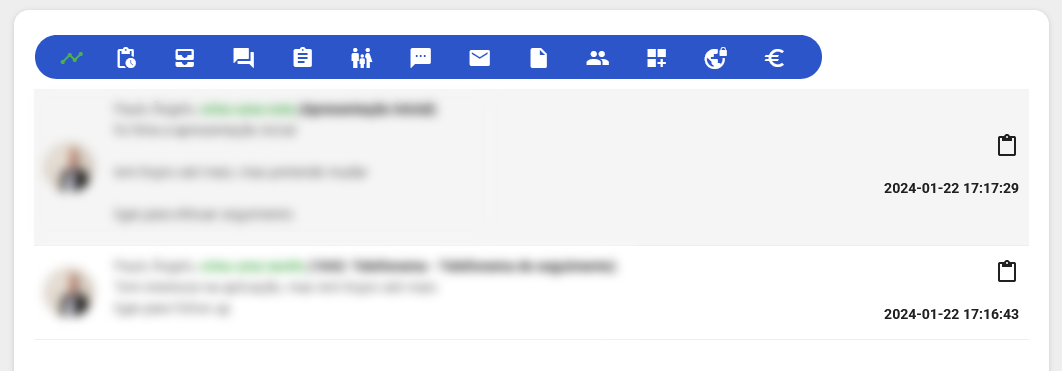 Em cada Entidade ou Lead, é possível visualizar, no lado direito, um conjunto de ícones que representam ações disponíveis.