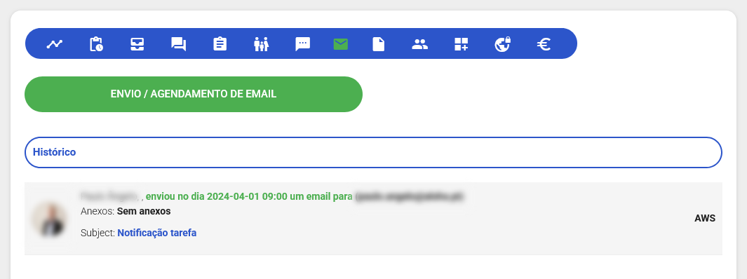 Pode enviar e agendar emails diretamente para o Contacto nesta aba.