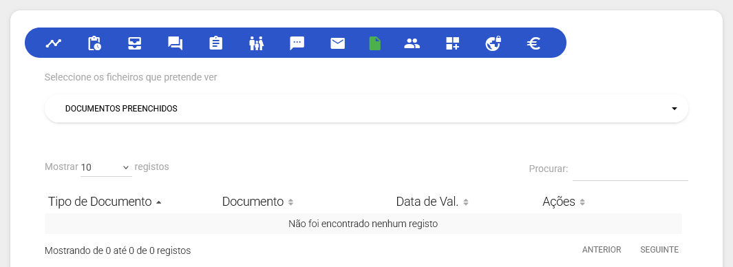 Através da tabela, pode adicionar tarefas a cada entidade, editar informações, criar notas e aplicar filtros.