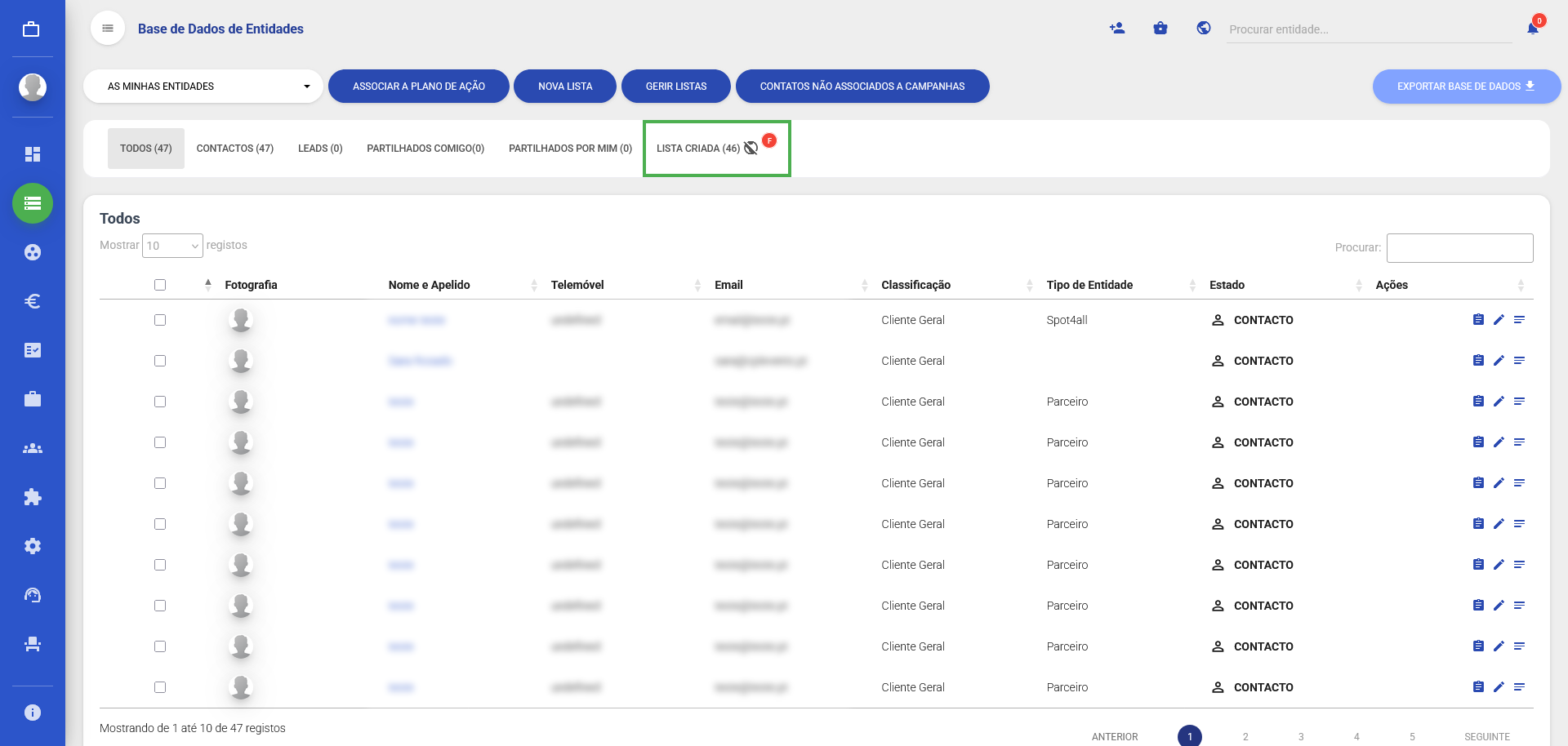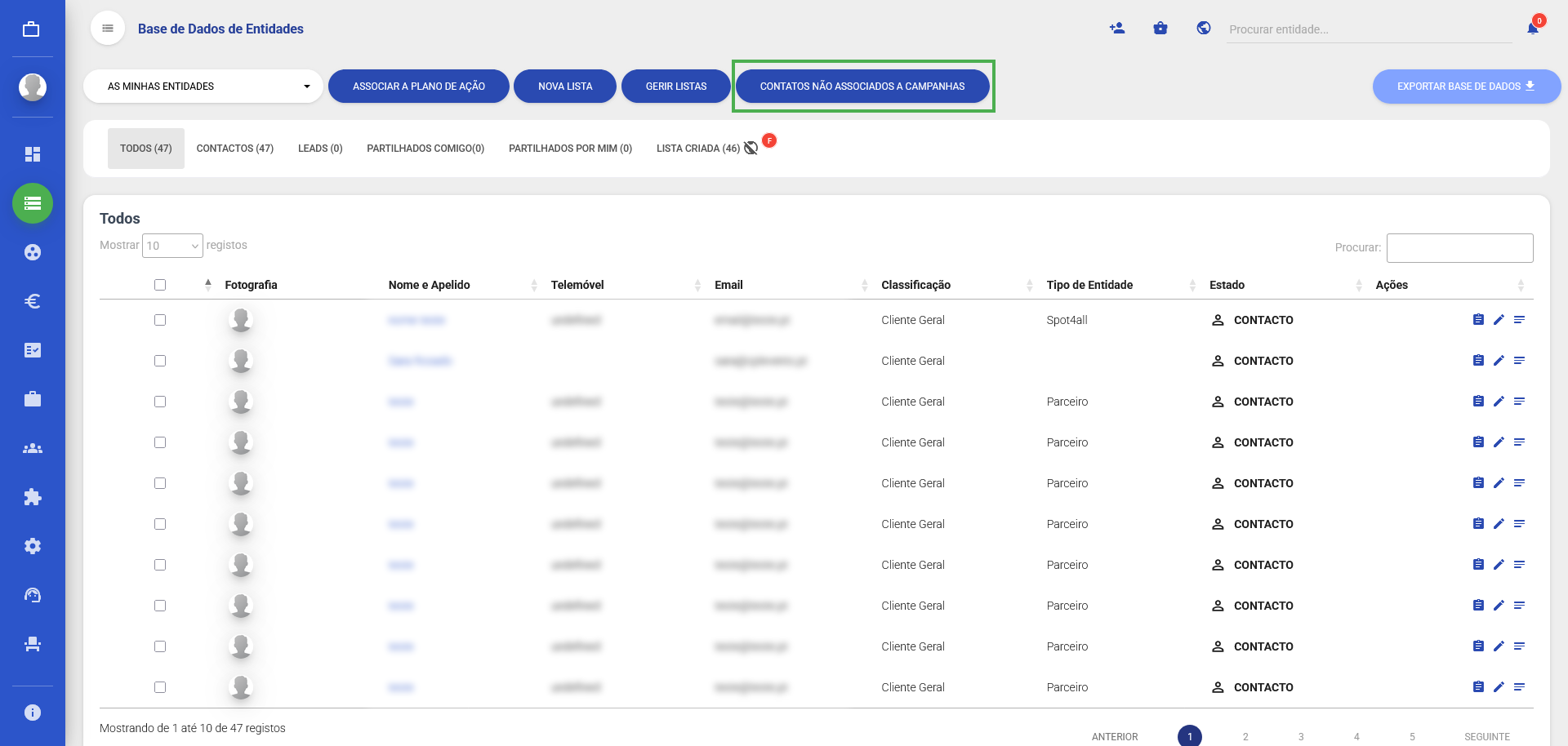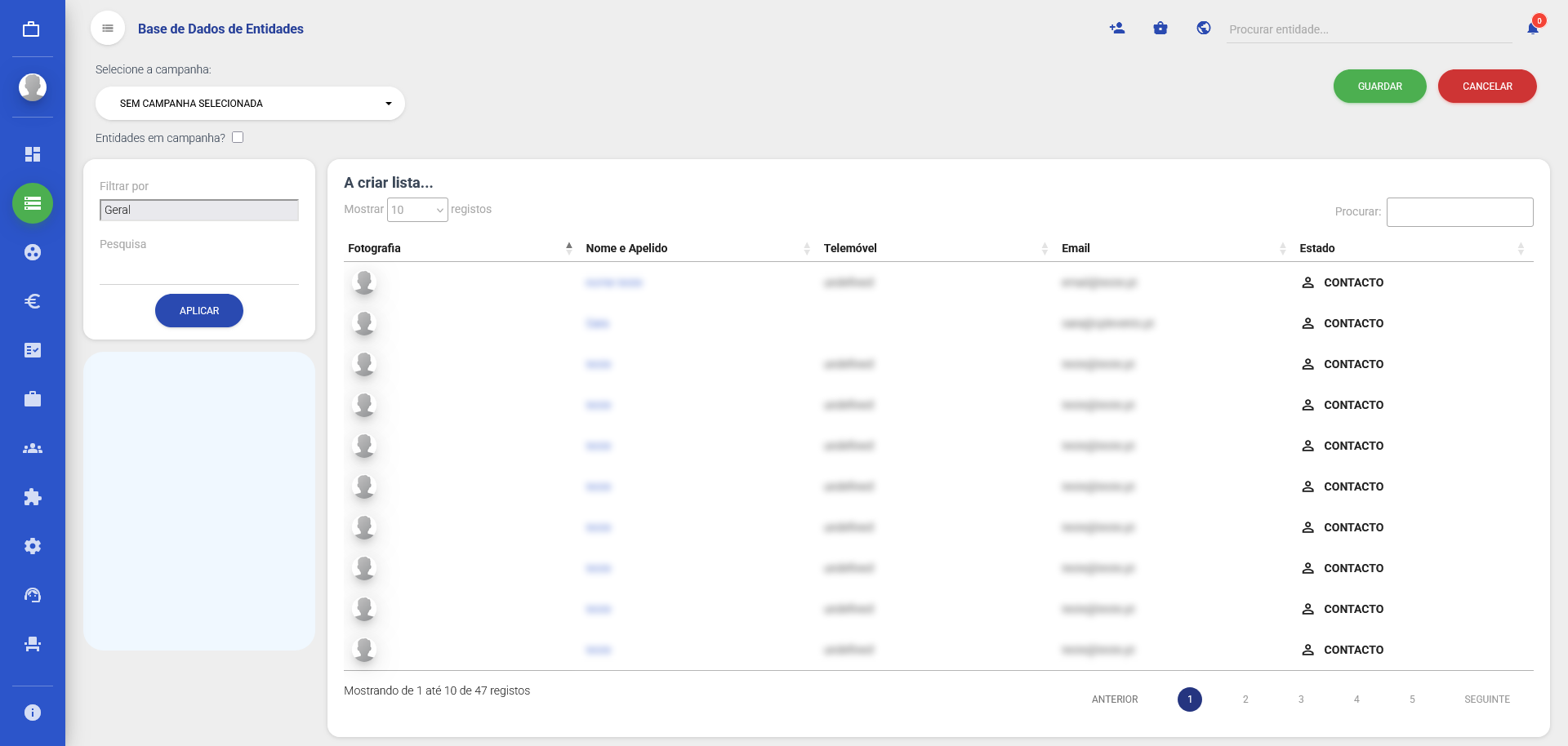 Neste menu encontra-se a base de dados com todas as entidades e Leads, bem como as listas às quais pertencem.