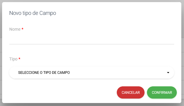 Dê um nome ao novo campo e selecione o seu tipo depois, clique em Confirmar para criar o seu tipo de campo.