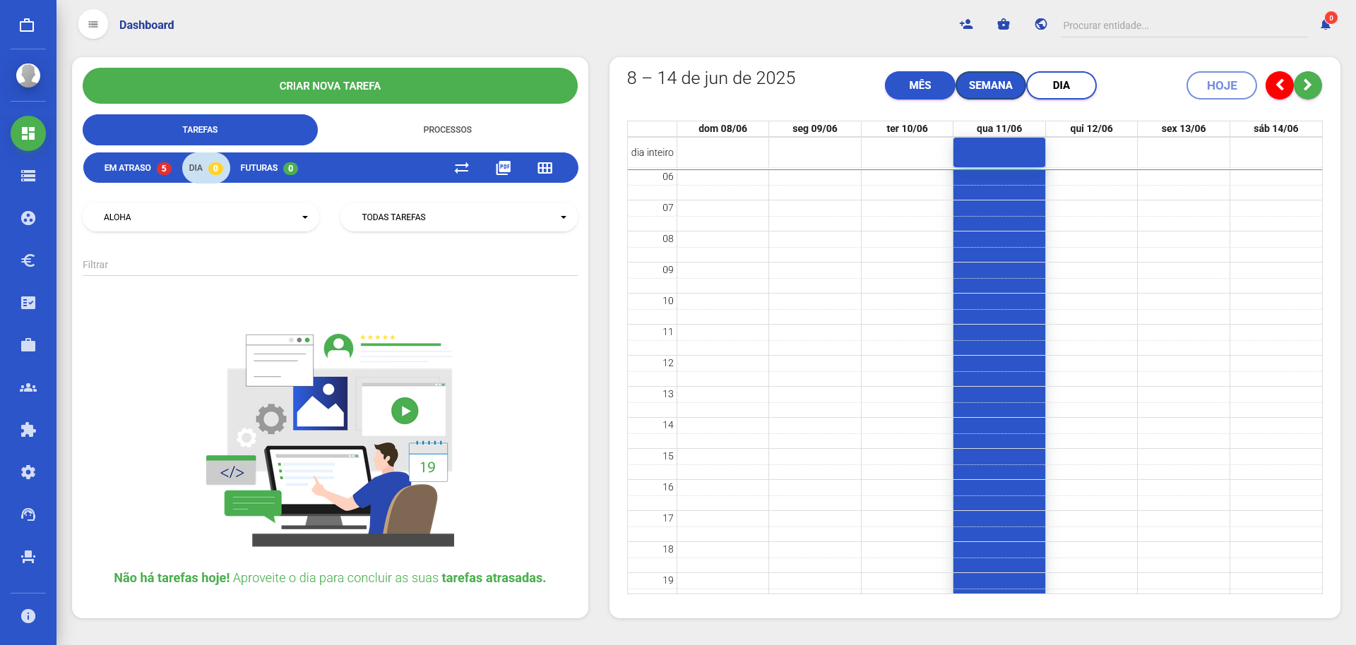 Nesta área, pode visualizar e criar tarefas e processos atribuídos à sua conta. Os administratores, têm acesso às tarefas e processos de todos os utilizadores da sua plataforma. Estes, podem também atribuir tarefas e processos a qualquer membro da equipa.