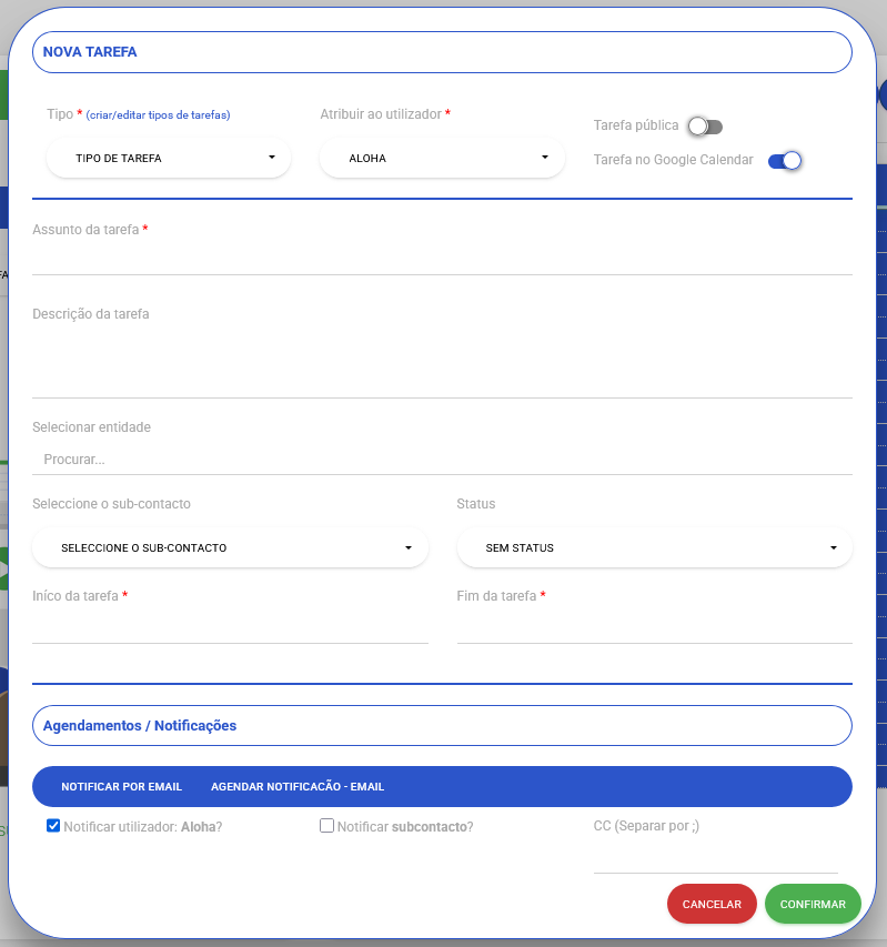 Tenha em atenção, que é necessário selecionar uma entidade e respetivo sub-contacto obrigatóriamente para poder criar uma tarefa.