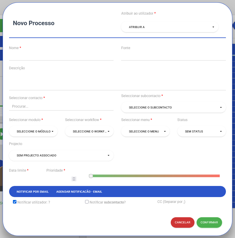 Para criar um novo processo, clique no botão “Processos” e, de seguida, em “Criar Novo Processo”. No formulário que surge, poderá: