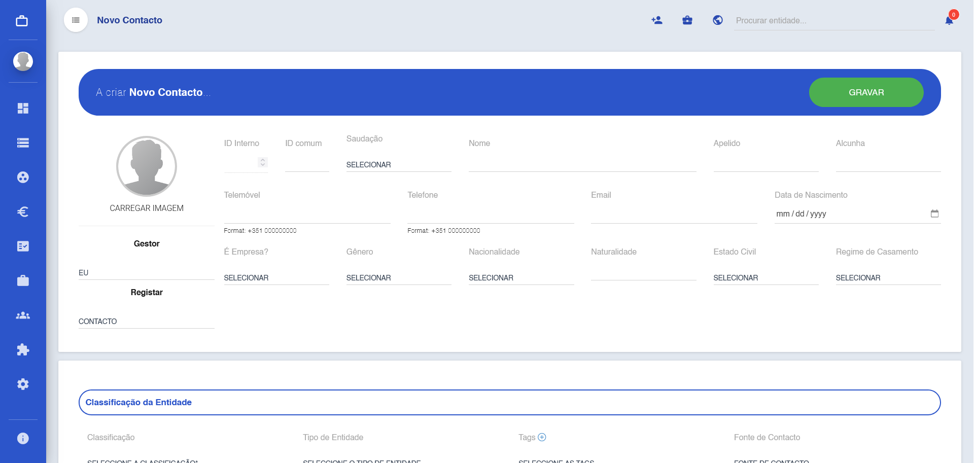 Nesta página irá ver vários campos, para que o seu contacto possa se manter o mais completo e possível. Para criar uma nova lead, deverá preencher os campos de Nome, Classificação e Tipo de Entidade obrigatoriamente.