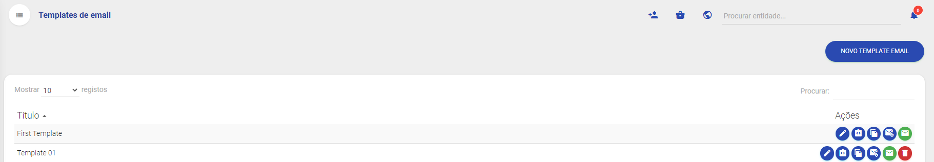 Da mesma forma que existem duas maneiras de trabalhar com os SMS, a plataforma permite o mesmo para os emails, no entanto, a criação de templates para os emails são feitos de maneira diferente. Ao clicar em “Novo Template Email”, o seu template ficará criado. No entanto, terá de criar um layout visual para o seu email.