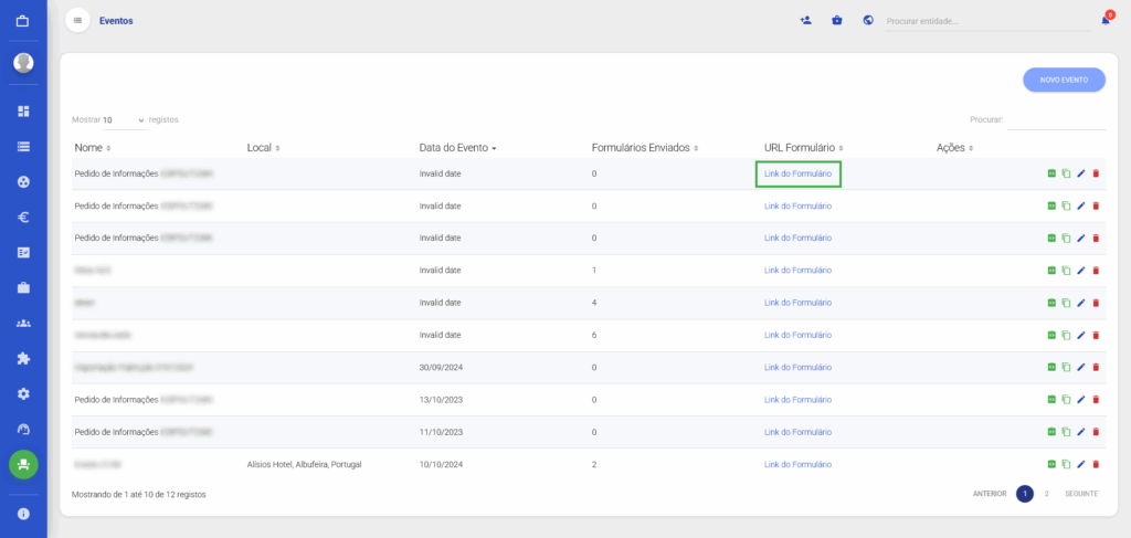 Pode visualizar o formulário do evento ao clicar na respetiva URL.