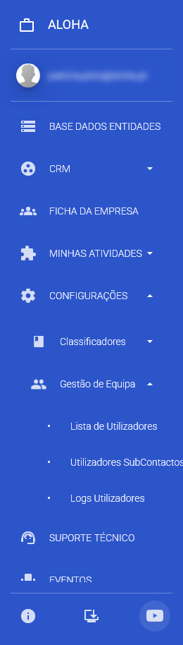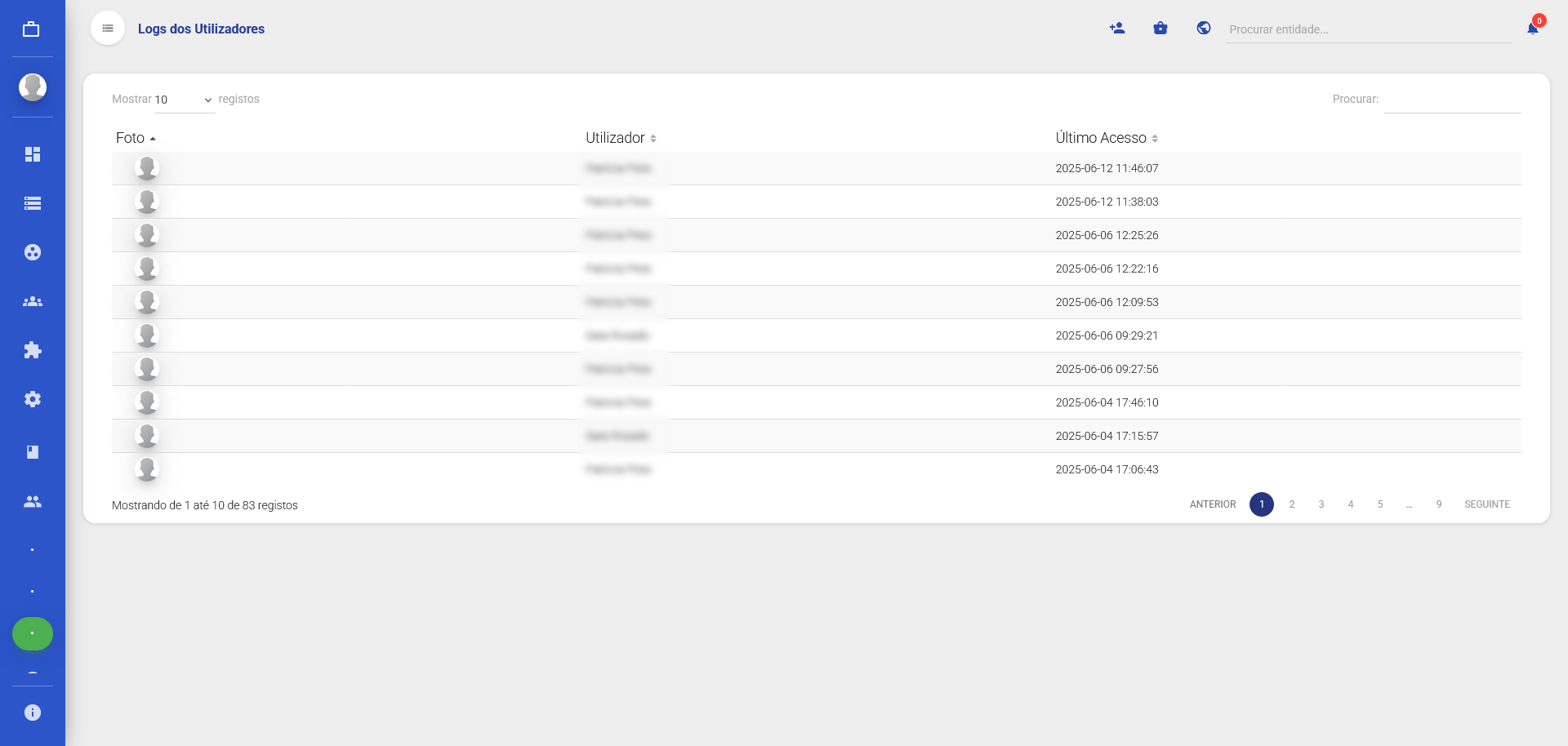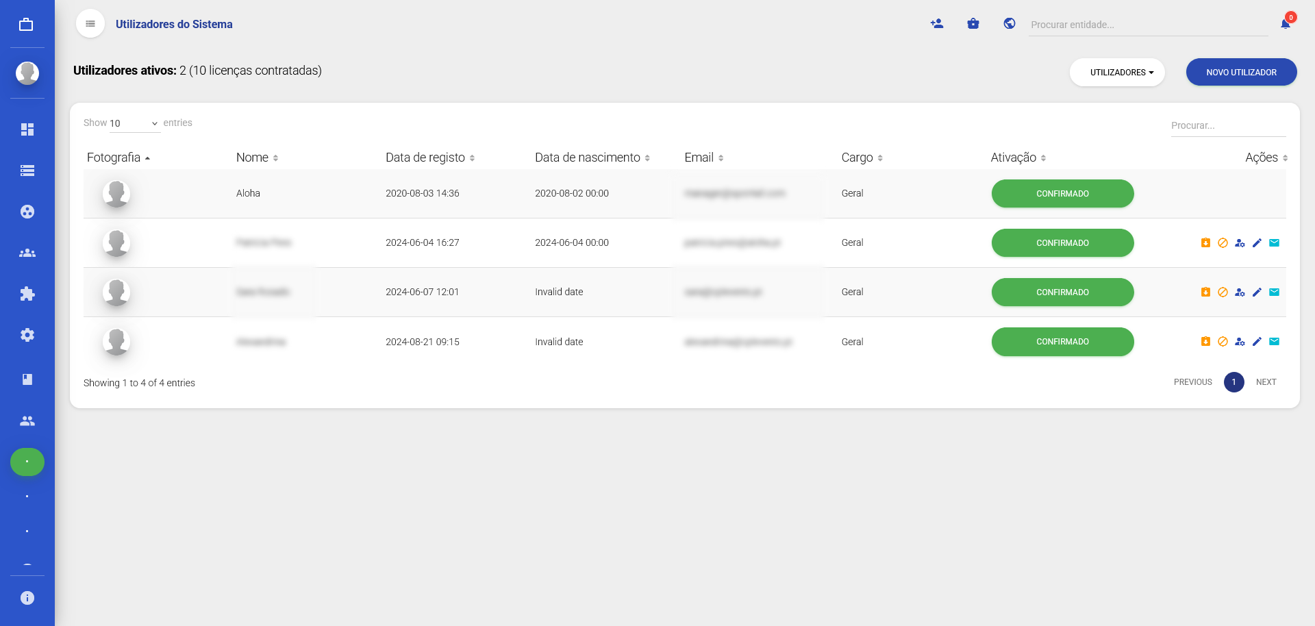Nesta aba, pode consultar a lista de todos os utilizadores registados na plataforma. Estão disponíveis várias opções para gerir cada utilizador, permitindo um controlo mais eficiente, como a alteração de permissões, edição de dados, entre outras.