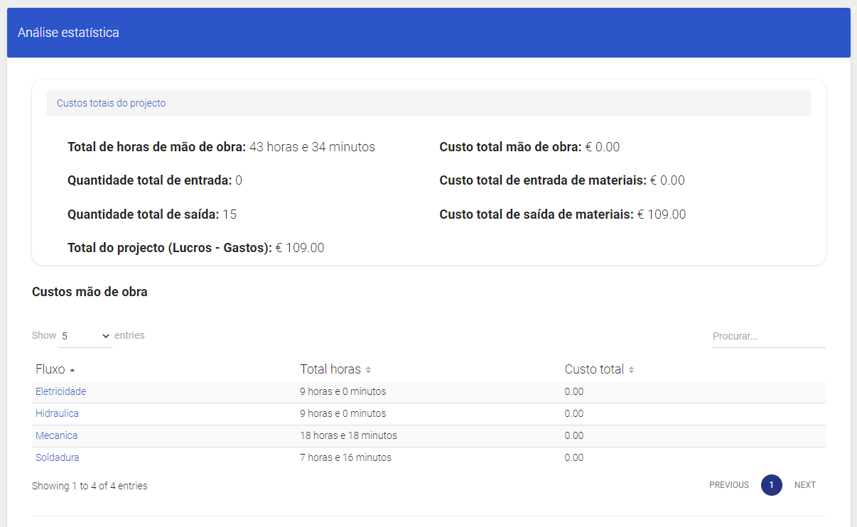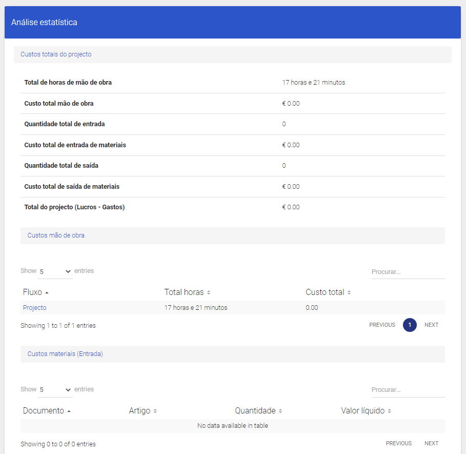 A plataforma disponibiliza também uma análise estatística onde poderá verificar um total de horas de mão de obra, entrada e saída de materiais (os seus custos e as quantidades) e o total do projeto.