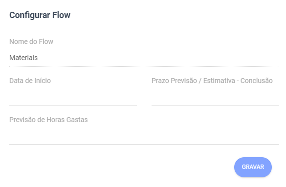 Será aberto um pequeno formulário de configuração do seu fluxo onde poderá colocar informações como a data de inicio, data prevista de entrega e uma previsão das horas gastas no mesmo.