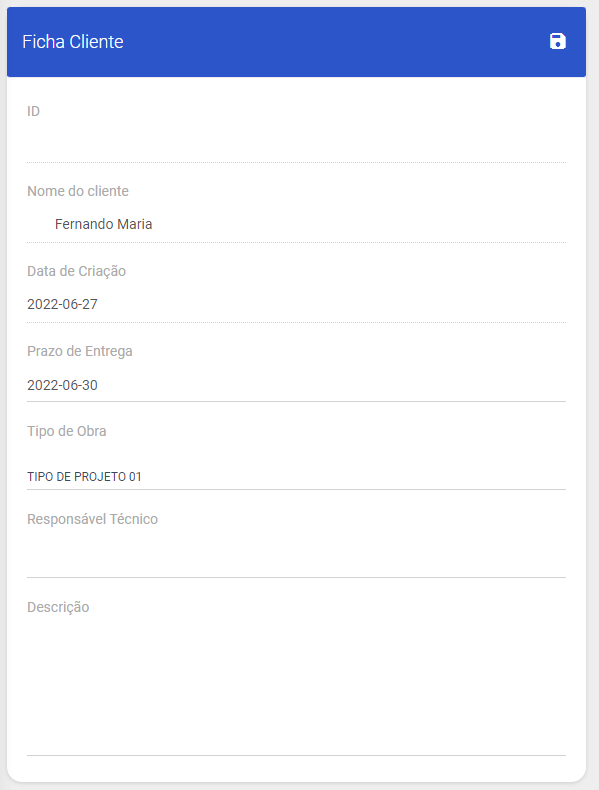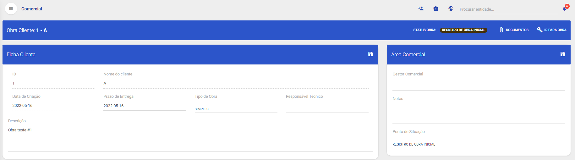 Ao clicar para “Ir para a sua obra”, poderá verificar a ficha do cliente e a área comercial, onde poderá fazer modificações dos dados já inseridos anteriormente.