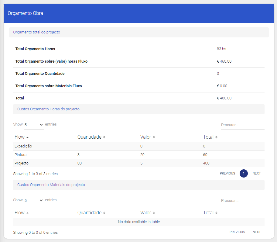 Poderá verificar mais abaixo, o orçamento da obra que demonstra o total de horas de fluxos, materiais e as quantidades. Tem a possibilidade de verificar a quantidade, o valor e o total para cada fluxo e material em específico.