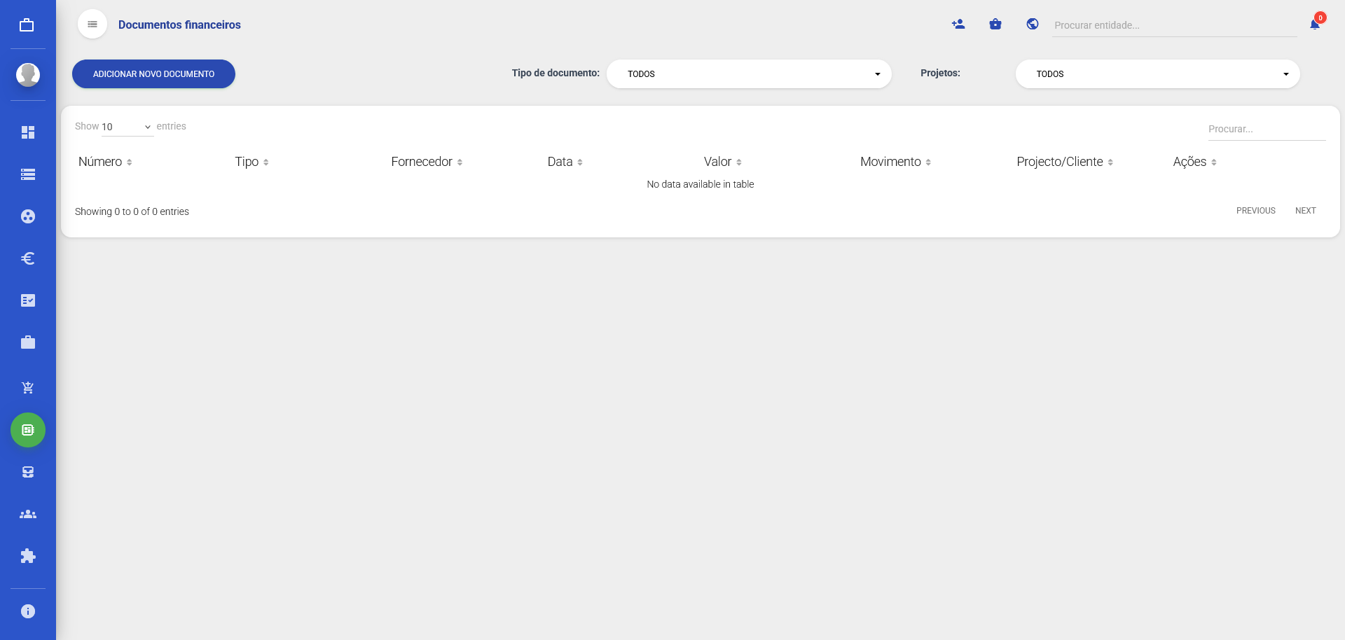 Permite ao utilizador registar documentos financeiros na plataforma, possibilitando a sua associação a obras previamente cadastradas. É possível filtrar os documentos por tipo e/ou por projetos existentes, sendo que os tipos de documento podem ser configurados na aba das Configurações do módulo Projetos.