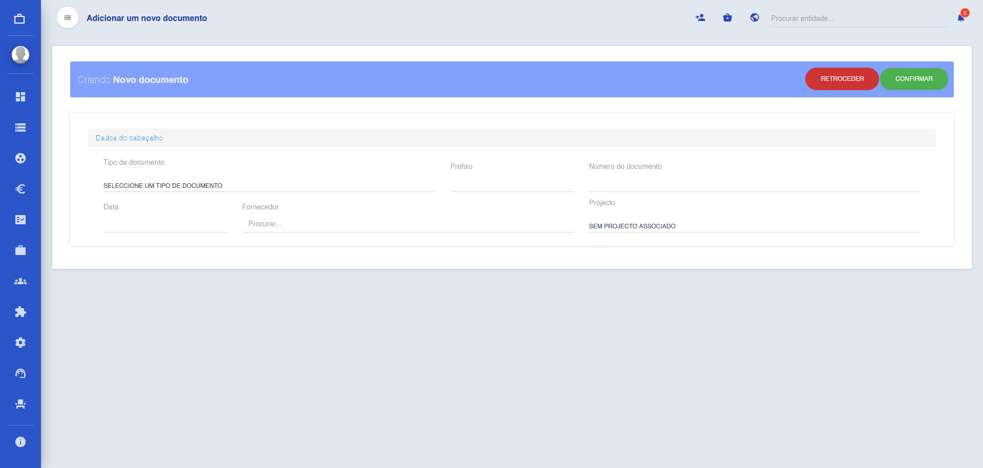 Após a criação dos Classificadores, poderá proceder à criação de um novo documento. Neste, deverá selecionar o tipo de documento, a data, o fornecedor, o número do documento e o projeto ao qual pretende associá-lo.