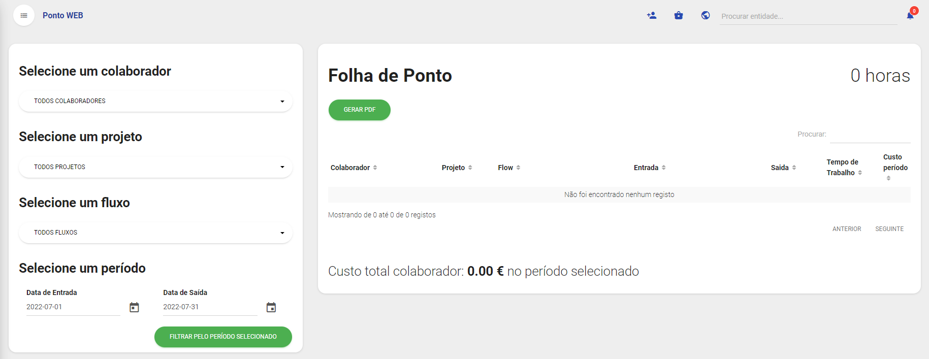 O Ponto Web é uma funcionalidade de registo de entrada e saida dos seus colaboradores dos seus projetos. Poderá verificar quem, quando entrou naquele determinado fluxo e verificar também de uma forma geral. Poderá analisar o custo total ou parcial dos projetos. Filtre por colaborador, por projeto, por fluxo ou por datas. Da forma que for mais eficaz para si!